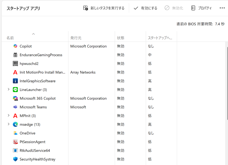 タスクマネージャーのOS依存サービスを除外して全て無効化して再起動。改善なし。