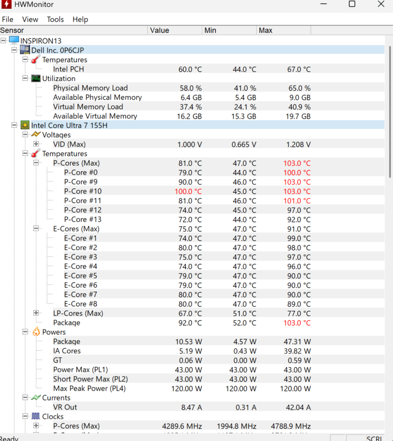 特にPコアに注目してほしいのですが、100℃を超えており、サーマルスロットリング(Thermal Throttling)、CPU、GPU、SSDなどの電子部品が高温になりすぎた際に、熱暴走や故障を防ぐため、自動的に動作クロック(周波数)や電力を下げて性能を制限する保護機能が発生、これの発生タイミングでYOUTUBEのフリーズも発生していました。